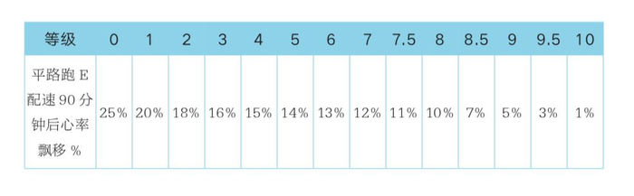在全程平坦的路段,若在90分钟内E配速的心率飘移在10%以内,就算具备优秀的有氧体能(5%以内是国家级的有氧体能 )。