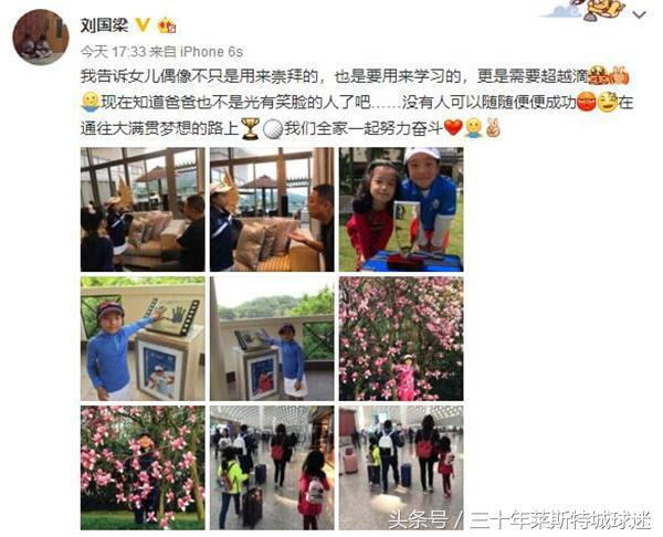 刘国梁在其个人社交平台写道:“我告诉女儿偶像不只是用来崇拜的,也是要用来学习的,更是需要超越滴。现在知道爸爸也不是光有笑脸的人了吧……没有人可以随随便便成功,在通往大满贯梦想的路上,我们全家一起努力奋斗。”而配图中则是刘国梁一家人背着高尔夫装备从高尔夫赛场凯旋,看上去,刘指导彻底进军高尔夫领域了!