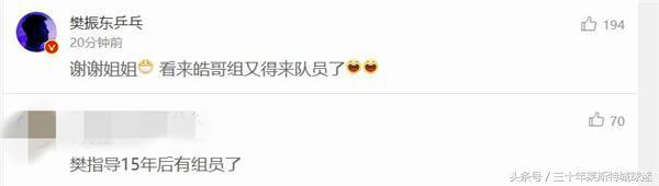 王皓的舞蹈演员美女老婆闫博雅在其个人社交平台说道:“我的小暖男,虽然满月、周岁的照片都没有爸爸的身影,但知道爸爸的辛苦@王皓乒乓,也祝贺小胖叔叔,告诉@樊振东乒乓,一个秘密:我今天抓阄抓了乒乓球呢!”面对樊振东这个来自师母的祝福和惊喜,樊振东回复称:“谢谢姐姐,看来皓哥组又得来队员了”,不过也有球迷恭喜小胖:“樊指导15年后有组员了!”