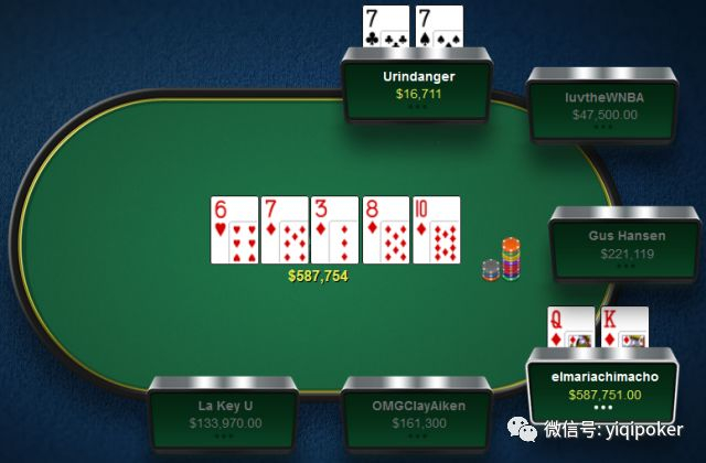 这手牌是三人进转牌,Zi "Urindnger" Dang和 Phil "OMGClayAiken" Galfond在翻牌圈下注后,底池达到$12.5万。转牌是第三张方块,还有很多顺子听牌的可能,elmariachimacho领先下注一个底池。Galfond弃牌,但是Dang最小加注,对手全下。Dang跟注,结果elmariachimacho击中K高的同花,击败了Dang的翻牌暗三。牌面最终没有对子,Guy Laliberte捞走他职业生涯中第二大的底池 $587,754。