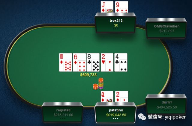 当时底池有三个人,OMGClayAiken弃牌后,Hac "trex313" Dang和 patatino在翻牌10d-6d-8c展开加注之战。两人的筹码都很深,将近300BB,底池在翻牌已经达到了$609,733。Dang的Jd9d拿到两头顺子听牌和J高的同花听牌,patatino则只有Q2d2d,裸Q的同花听牌。两人在转牌2h打到全下,河牌是4c。