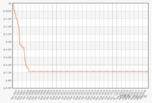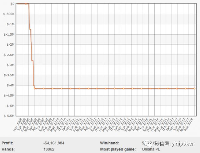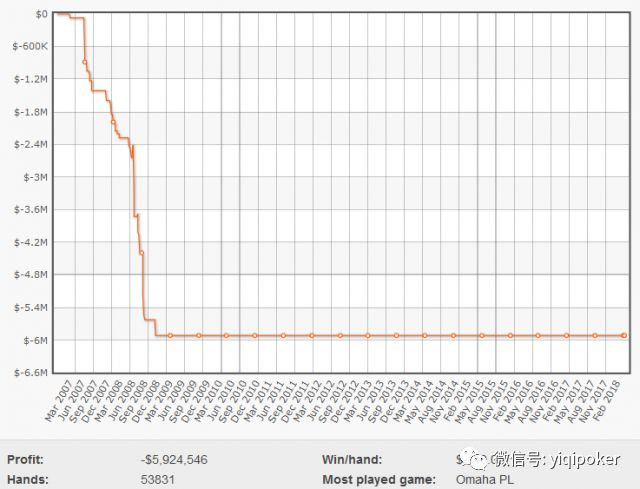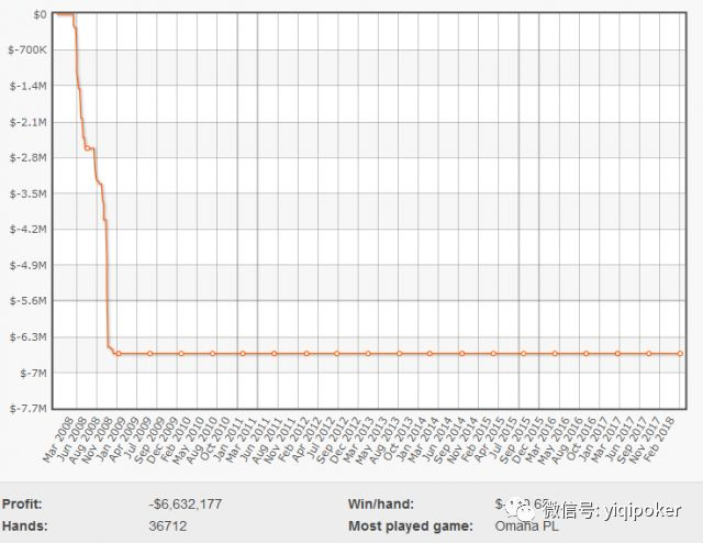 据我们所知,Guy第一个注册的账号是 "noataima"。这个账号首次现身牌桌是在2006年10月17日,最后一次则是2008年4月。这可以说是Guy输钱最多的一个账号了,总共输掉了$7,067,935,范围遍及高额桌NLHE和PLO。请注意,我们只是从2006年末才开始留意到这个账号,所以他用这个账号输的钱很可能是超过$700万的。