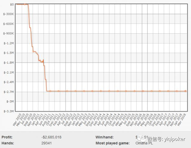 我们知道的Guy在全速扑克的最后一个账号是 Esvedra 。他在2010年到2011年用这个账号玩了一年,打了29,341手牌,总共输掉$2,685,018。