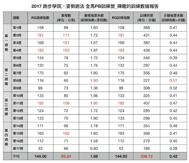 平均周训练指数:144。加入训练营前三周,陈龙还没开始吃博士的课表前的训练指数都在200以上(分别是158→201→229),而这十七周的训练平均只有144,最高也193。190以上有三次,分别在第一与第三周期。