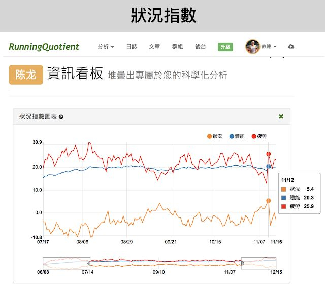我们注意到陈龙在比赛前的状况指数升到+5.4,但训练营中的其他跑者大都在+1~3之间,但他们的训练量也相对比较小,这代表之前我们所归纳的结论:训练量愈大的跑者(例如超马跑者),在比赛前必须让训练指数升到比较高的数值才会有好表现。以之前我所观察的几位“体能指数”练到20以上的跑者来看,当他们在比赛前的“状况指数”升到+5以上时,大都会跑出好成绩。但如果“体能指数”在15以下时,状况指数只要升到+1~3之间即可。