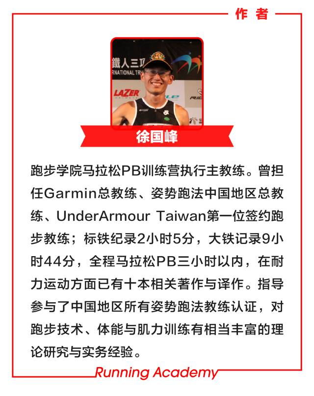 徐国峰的标铁纪录是2小时5分,大铁记录9小时44分,全程马拉松最佳纪录在3小时以内,在耐力运动方面已有十本相关著作与译作。