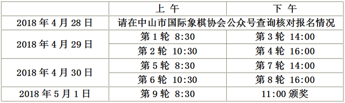 2、参赛棋手报名后请及时在中山市国际象棋协会公众号上查询核对报名情况,如有错漏请及时与承办方联系。比赛前无须提前报到,4月29号早上8:30准时开赛(比赛计时钟开启),棋手提前半个小时到达赛场,如发现公布的对阵表,与要报名的组别有出入,务必在赛前找该组裁判,请求纠正,比赛迟到15分钟作弃权处理。