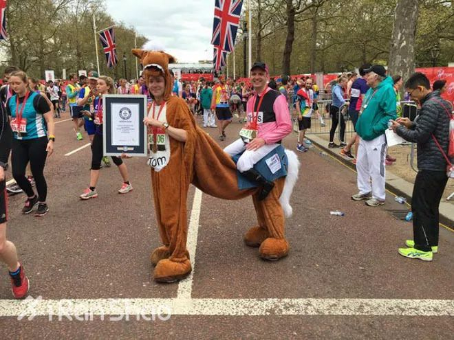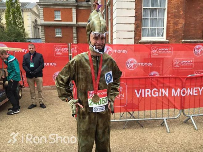Ben Evans加上这次已经跑了17次伦敦马拉松,他这次成为穿着恐龙服跑的最快的跑者,成绩是3:08:07.