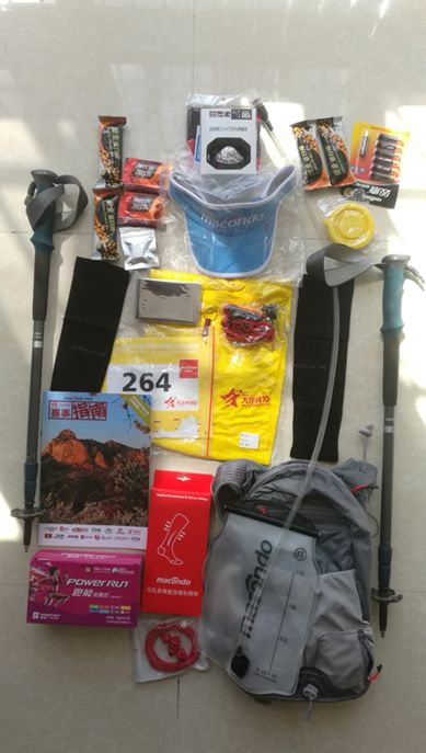 参赛的头天晚上准备好相关的东西,22:50就睡觉了,想想第二天就首次50公里,首次夜跑,咋没有点兴奋劲呢,感觉参加了很多次似的,无所谓的样子,一会就睡着了。起床后吃过早饭,把所有的装备准备好,照了定妆照,盗了群里的一些图,发了朋友圈。定妆照里面少了新买的登山鞋,还有味多美的面包和一根火腿肠。看到里面号码布上面的银白色的东西了吗?我一直不知道是啥,后来才知道是保温毯。组委会在赛事通知中说是要发保温毯,我以为是一个厚厚的毯子呢,心想这么小的越野包怎么装啊,后来才知道,保温毯是这么一个小的东东,据说失温的时候用它很管用,野鸭湖冰雪马拉松也发这个了,但都没有用到,希望以后也用不到。