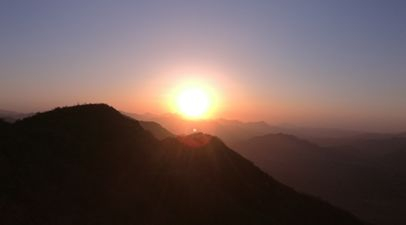 马上就要到山顶了,一看表5点多了,天已经很亮了,关了头灯,迎接日出,没想到,还要下山一段,才能上到山顶,看了一下,下山的路还很长,心想看不到日出那一瞬间了,确实,等我爬到对面的山上的时候,太阳已经完全升起,虽然不能拍到日出,完全出来的景象也很好。于是停了下来拍照,这是我除了进补给站,第二次停留拍照,耽误了时间,一个哥们很快就追上来了,我马上提速前行。