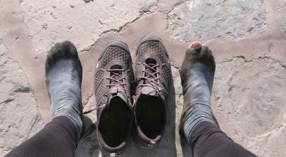 一路跑完,真的是一点困意都没有,也没有感觉到疲劳,也是非常出乎意料。终点冲线后,先是领取完赛奖牌、T恤衫、完赛毛巾、宝矿力,然后是拍照,就是在本文开始的完赛照片。然后拉伸运动,喝水补充盐丸,清点了一下装备,全程下来,棒用了2根,胶用了1个,盐丸用了2袋,水补满了一次,还剩一些,差不多用了2升多水。右脚大母脚趾在凤凰领拉练的时候受过伤,当时鞋比较紧,就是我16公里组换上的黑色的阿迪达斯的鞋,它就不是越野鞋,是普通的运动鞋,不适合长距离越野,把大母脚趾顶坏了。我后来又去迪卡侬买了大半号的专业越野鞋,这个鞋就没有问题了。赛前,我特地在群里面提醒大家剪指甲,我也剪指甲了,但还是把袜子顶破了。