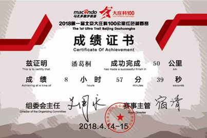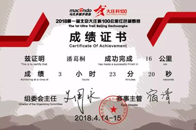 由于天气原因,100公里组别取消,100公里组的选手可以选择参加50公里的比赛。因此,作为唯一一位同时参加了50公里组(第47名)和16公里组(第148名)比赛的人,幸运的成为了首届大庄科跑的最长距离的选手,成为了66公里组(这是我自定义的组别)的冠军。为此我幸运的得到了与赛事美女宿总监合影留念的机会。