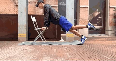 俯卧撑姿势,双手支撑在台阶或箱子上,单脚撑地,非支撑脚脚掌向臀部反复拉动。