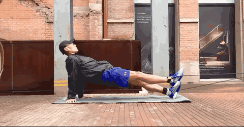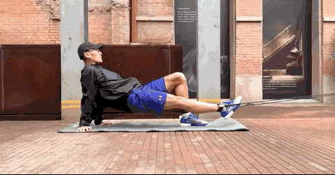 采用躺姿,弹力绳固定处与肩膀齐高,双手手肘撑地让上半身抬高,脚掌向臀部反复拉动。