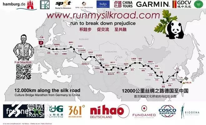 深爱中国的德国人Kai沿着陆上古丝绸之路,跑步穿越帕米尔高原以及塔克拉玛干沙漠。从德国汉堡开始,计划经过波兰、白俄罗斯、俄罗斯、哈萨克斯坦、乌兹别克斯坦以及吉尔吉斯斯坦,然后进入中国,横跨中国,最后抵达上海。途径2大洲8个国家,全程超过12000公里。Kai采用跑9休1的方式,休息的一天作为文化活动日,宣传中国以及当地的优良文化。Kai从德国跑向中国的主要目的是: