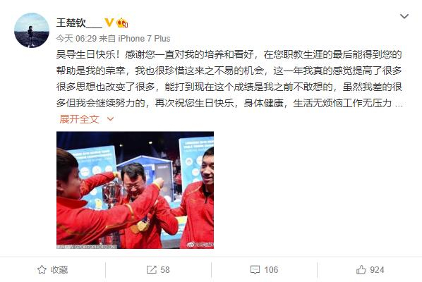 在生日当天,王楚钦也发微博给吴敬平教练送去了祝福: