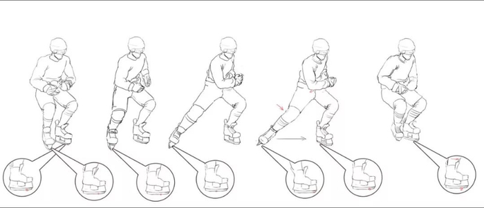 第一个不一样的点在于我们的冰刀与冰的触点,从蹬冰开始到腿伸长至最大值时,冰刀与冰面的接触位置从前面移动到了中间(如上图),而往后的运动因为不再有腿部的延长而变成了脚腕的伸直,着冰点从脚心转移回到了前脚尖。第二个区别也是更重要的区别是发力的意义变了,腿从单纯的向后蹬冰演化为了一部分向后发力而另一部分力将脚尖弹回到身体正中央(会有一部分前脚掌的发力)。这就标志着另一个更主要动作的开始,放松。