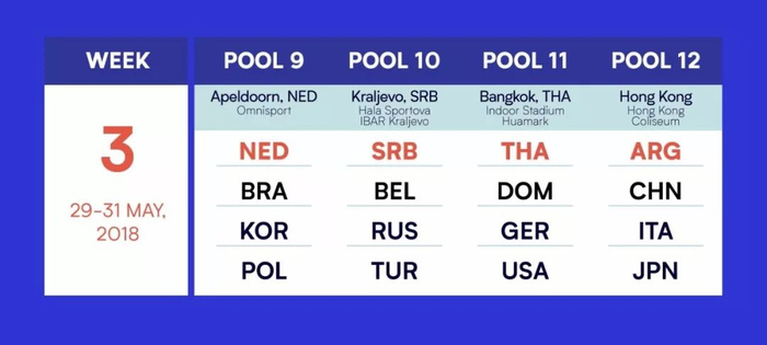 本周二(5月29日),2018年世界女排联赛分站赛第三周的比赛即将在4座城市展开,其中欧洲有2站:荷兰的阿帕尔多伦(Apeldoorn)和塞尔维亚的克拉列沃(Kraljevo),亚洲也有2站:泰国的曼谷(Bangkok)和中国的香港。其中香港是以独立赛区的身份申办的比赛,所以名义上不算中国队的主场。