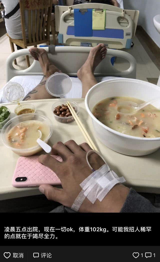 更打动我的,是一张他在病床上吃饭的照片,他说,“凌晨5点出院,现在一切OK,体重102kg,可能我招人稀罕的点就在于竭尽全力。”从124kg,减到102kg,这相当于从重量级减到了次中量级。
