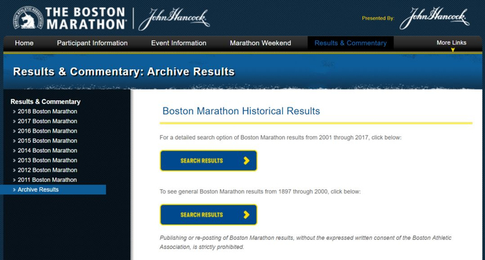 比如波士顿马拉松,你可以在官网首页的“Results & Commentary”里面找到历年的赛事成绩: