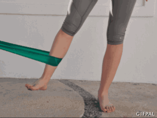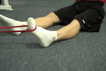 坐地面,双腿前伸。将一弹力训练带(建议选择中度弹力即可)一端套住脚掌,另一端固定(或用手抓住),足部向内牵拉弹力带,做踝关节内翻训练。