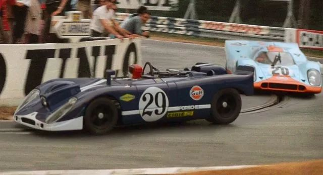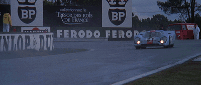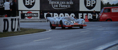 值得一提的是,电影中许多镜头都是源于1970勒芒的真实拍摄,为了拍出最真实的画面,片方安排了一台保时捷908赛车(拍摄车)直接参与到1971年的勒芒比赛当中,目的就是为了拍摄比赛的状况,电影中的那些高速镜头,正是由安装在908身上的3台摄像机拍下的。(真实源于参与,大家留意下图中的参赛的908前面有一个突出的摄像机。)