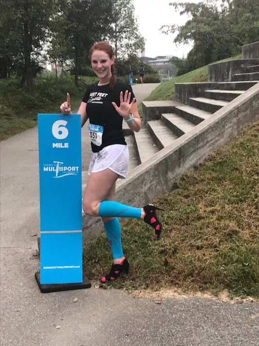 2014年,在参加查塔努加一个铁人三项比赛志愿者活动时,Sewell被吸引并开始了自己的跑步之旅。在先后完成三次马拉松后,她相信她可以穿高跟鞋征服一场马拉松。