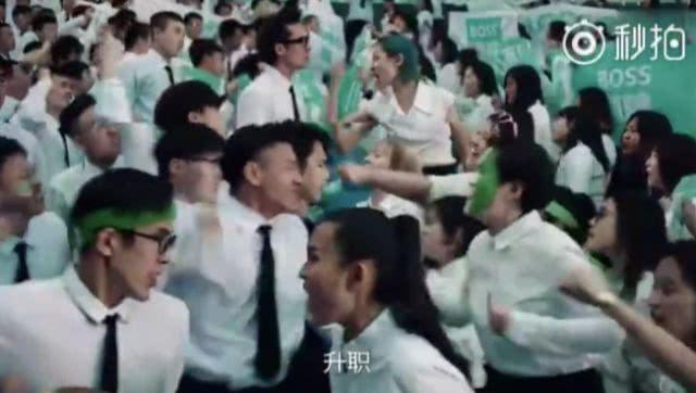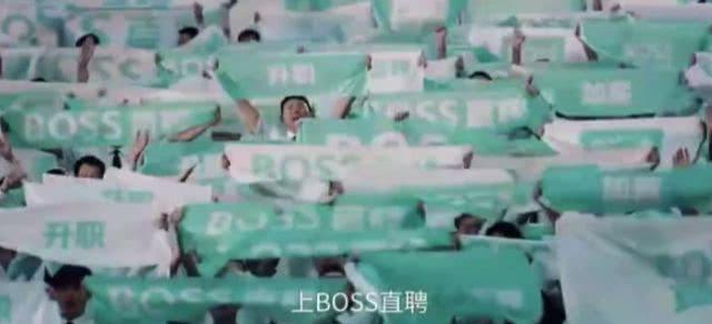 一群青年男女,穿着白衬衫,扯着boss直聘的绿白条横幅,挥着boss直聘的大旗,齐声呼喊“找工作,上boss直聘。找工作,直接跟老板谈。”