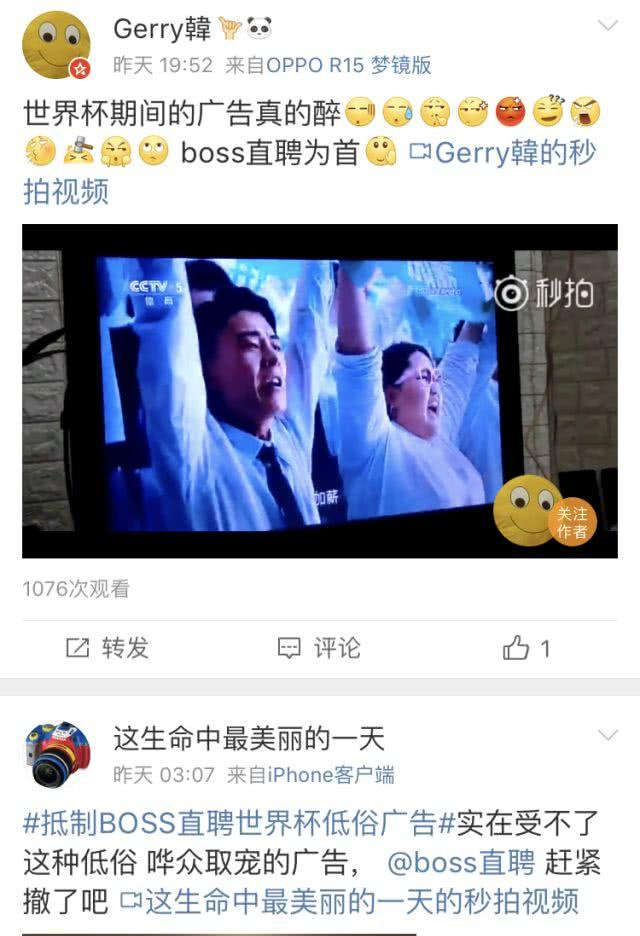 “boss直聘世界杯足球赛直播中的广告太烂,同仇敌忾、声嘶力竭的应聘者,活脱脱一群刚从传销窝点跑出来、还要直接跟传销头子讨薪的受害者,谁招聘吓死谁!高知名度+低美誉度=臭名昭著!”