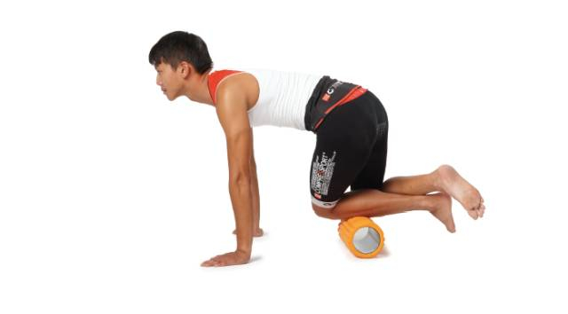 如果练习跑步时有前胫痛的问题,可以多做前胫肌的拉伸与按摩动作。将泡沫轴置于左小腿前侧胫骨下,双手撑地支撑起身体,前后滚动按摩,针对特别疼的痛点着重“按”10秒不动。之后换右侧。