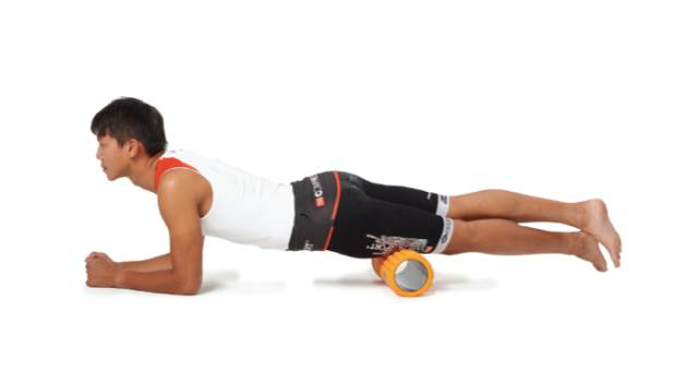 双臂撑地,俯卧于地面,双腿交叉,左腿在下。将泡沫轴置于左大腿下方(前侧),前后按摩滚动。针对特别疼的痛点着重“按”10秒不动。之后换右侧。