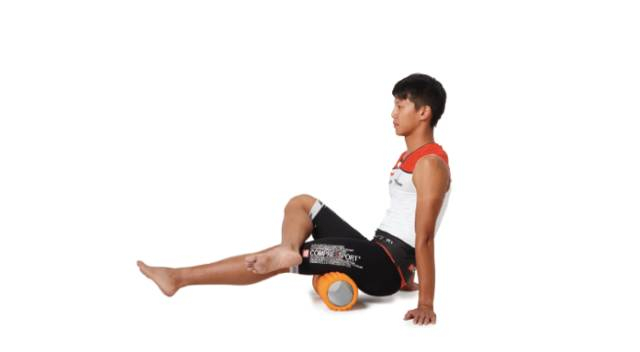 双手在身体两侧撑地,左腿伸直,将泡沫轴置于左大腿下方(后侧),右腿弯曲搭在左腿上,前后滚动按摩。针对特别疼的痛点着重“按”10秒不动。之后换右侧。