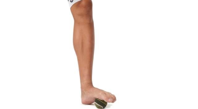 将按摩小球置于脚底,前后左右滚动按摩,针对特别疼的痛点着重“按”10秒不动。