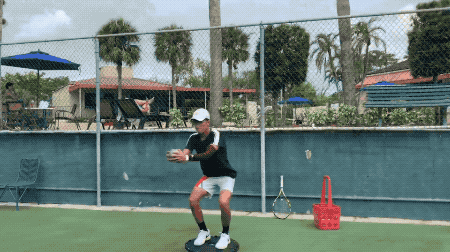 如上图所示,第一项训练。小选手踩在圆底胶质平衡板上,双腿开立与肩同宽,膝部弯曲,向后坐,呈类似马步状;双臂向前伸抱住实心球,肘部自然弯曲,向左右侧做类似引拍+挥拍的动作,从而锻炼选手的平衡性。该训练左右侧各四次。