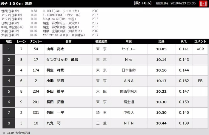 第102届日本田径锦标赛,6月23日进行了第二天的角逐。这一天的重头戏是男子100米决赛,日本接力队(里约奥运会时)第一棒山县亮太跑出10.05秒折桂,追平了赛会纪录。