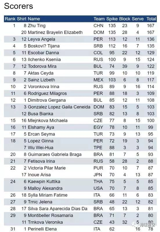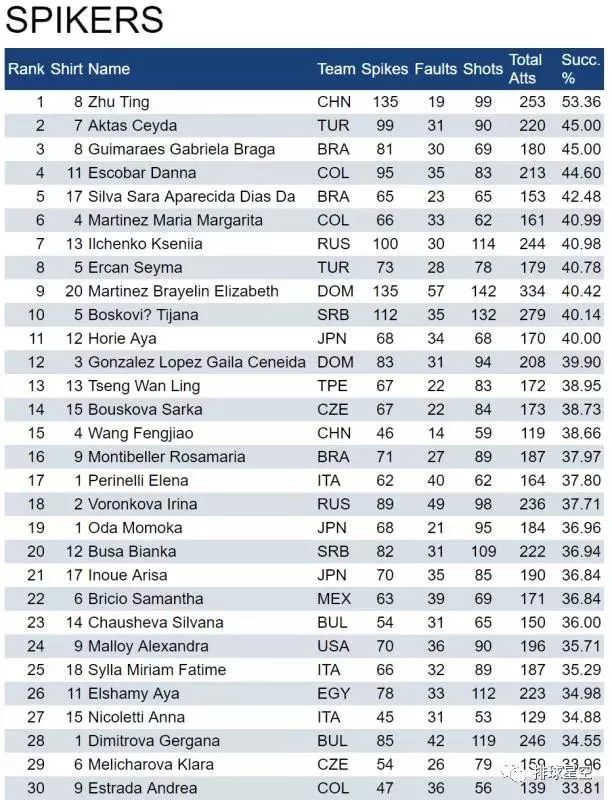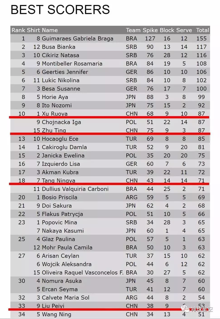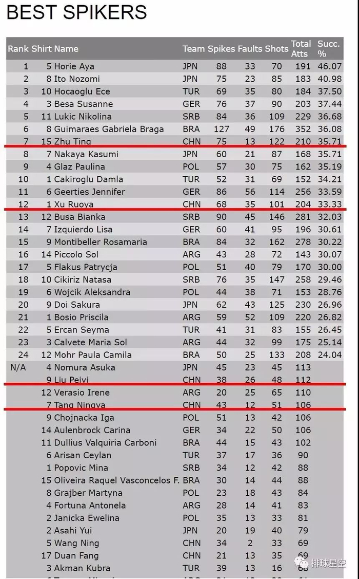 这是赛事的扣球成功率和扣失(包括失误和被拦!)的统计。这个年龄段的运动员,技术普遍粗糙,各队的主要攻手,基本上都是得两分送一分的样子,只有朱婷例外。此时还不到17岁的朱婷,对失误、被拦的控制,高出其他人至少一个档次,以至于她的扣球成功率虽然只排在第7位,效率却高居第1!两年以后,我们在电视上看见朱婷的时候,发现她不舒服的球不轻易发力,拍过去,绝不送分给对手。场外成功但保持谦虚,场上霸气但不失冷静,这是朱婷天生的素质。