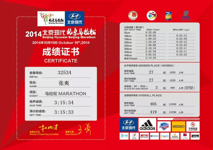 张爽加紧步伐超越了身边的许多跑友,按照计划时间向前跑着。最后7公里,她1 公里1 公里的顶着跑,快到终点转弯处,抬手看了下手表,3小时25分。可跑过转弯,终点计时显示3小时28分。此时,她把全身的力量调动了起来,拿出平时跑400米强度的速度冲向终点。最后证书时间为3小时29分18秒,张爽实现了自己第一个全马既定的目标。