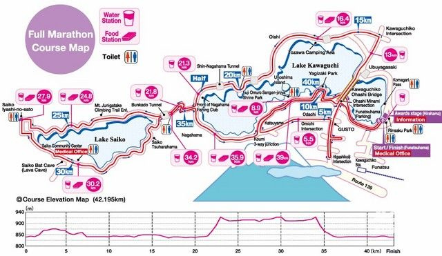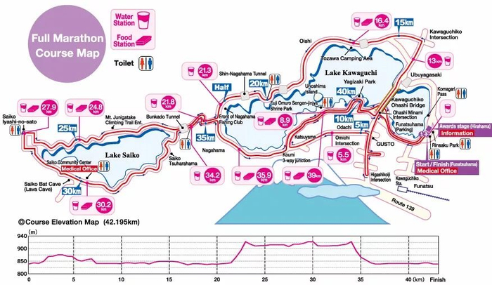 35k长滨折返,在幸福的下坡捡回丢掉的信心,循右沿河口湖南岸道路前进,这一段路弯蜒但是平坦,最后一个关门点在小海公园处(37.6km),通过后就赶快奔赴终点吧!