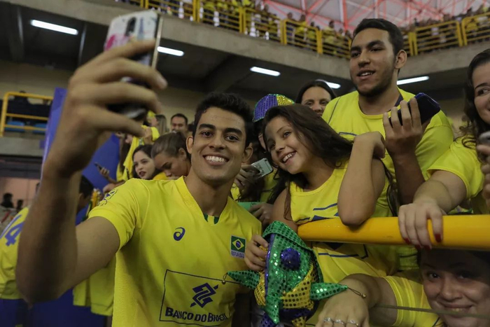 分站赛中,巴西男排的年轻队员与球迷互动