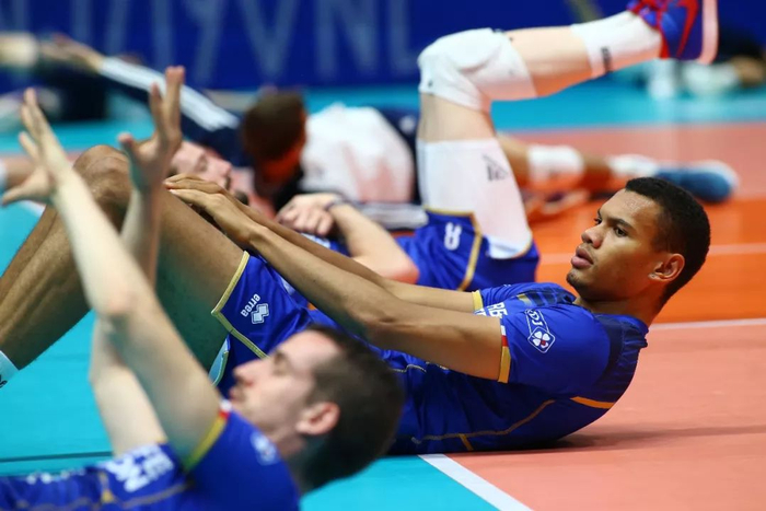 分站赛中,法国男排的队员在做热身