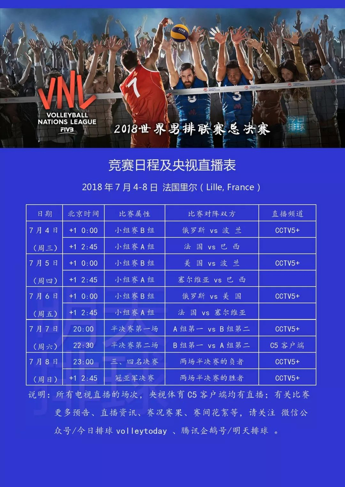 当地时间今天傍晚18点,也就是北京时间今天(7月4日)午夜24点,2018世界男排联赛总决赛将在法国里尔开打,首场举行的是小组赛B组俄罗斯男排和波兰男排之间的比赛,央视体育赛事频道(CCTV5+)直播。