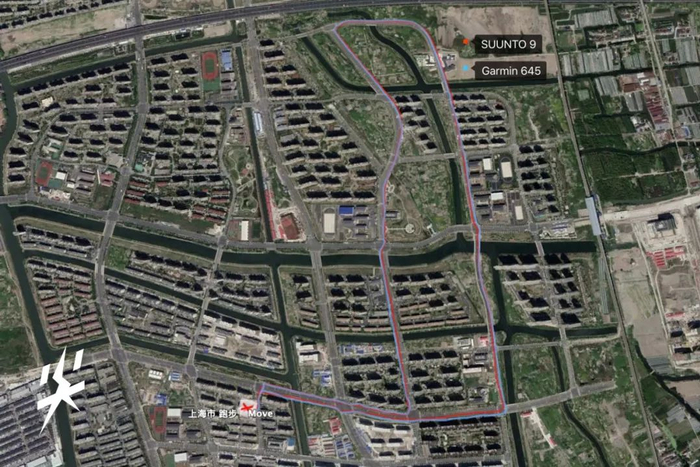 在周边环境不太复杂的路线中,第一次测试SUUNTO 9和Garmin 645的轨迹图重复率相当之高,就连路口的小小弯曲轨迹都几乎一致,精确性的表现非常出色。
