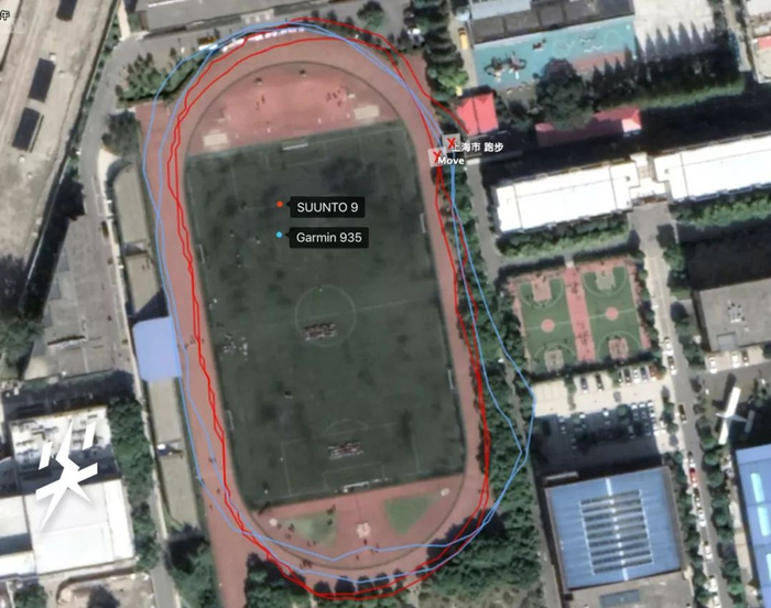 另外在绕圈测试中,仍然使用了SUUNTO 9和Garmin 935这两块手表。从轨迹图的对比来看,SUUNTO 9要更接近于实际路跑的路线。不论是上弯道还是下弯道,SUUNTO 9很少出现大范围漂移的问题。