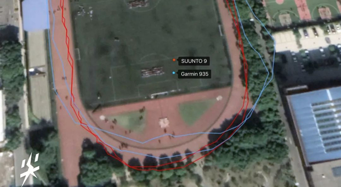 而在第二次测试中,周边环境换到了较为复杂的路段,SUUNTO 9在连续的折返中出现了轨迹漂移的问题,相比而言Garmin 935的表现要更好一点。这一部分也表现出SUUNTO 9应对复杂环境的稳定性有待提升。