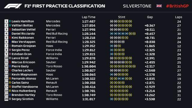 F1英国站第一次练习赛成绩: