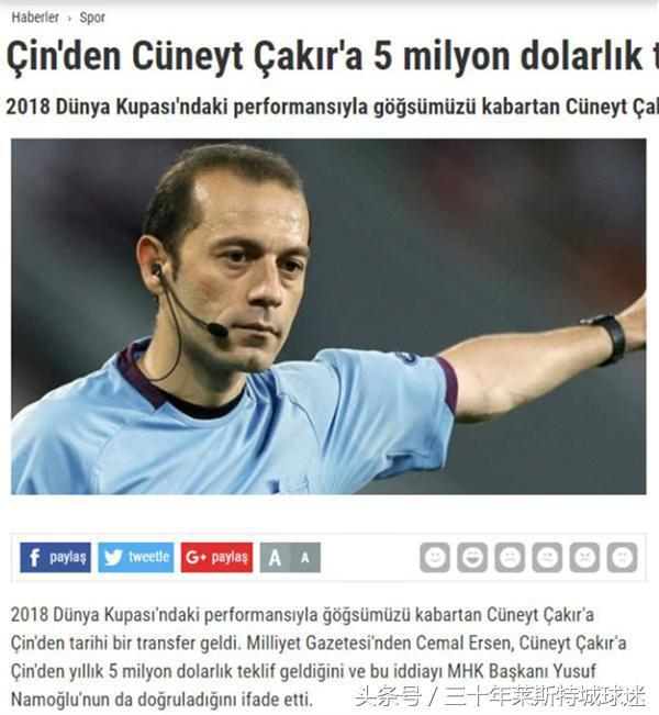 根据土耳其媒体《Milliyet》报道,中国足协有意提供500万美元(约合3300万人民币)年薪,邀请土耳其第一名哨卡基尔前往中超联赛执法。此人是欧洲足坛现役裁判中最优秀的几人之一,他曾多次执法欧洲顶级赛事,本次世界杯还执法了阿根廷2-1战胜尼日利亚的关键战。值得一提的是,阿根廷和尼日利亚的那一战,梅西因为拖延时间被卡基尔果断出示了黄牌。