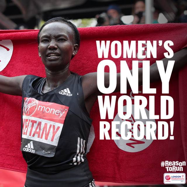 2017年的伦敦马拉松上,35岁肯尼亚名将玛丽·凯塔尼Mary Keitany以2:17:01的成绩夺得女子冠军,并打破了纯女子选手比赛的马拉松世界纪录。这意味着无论是纯女子赛还是男女同跑,这两项女子马拉松世界纪录都被伦敦马拉松赛道包揽了。