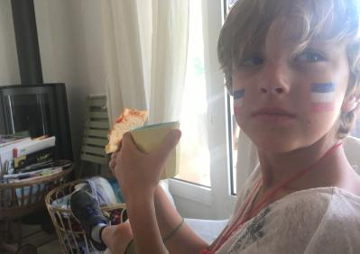 在本届世界杯比赛中,刘烨的妻子安娜和儿子诺一的脸上画上了法国小国旗,家中还插上了法国大国旗,一家人都是非常"敬业"的法国球迷。而刘烨在这一家球迷中显得比较另类,为了烘托气氛,他在自己脸上画了红色。