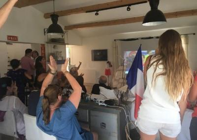 早在比赛开始之前,刘烨家中的布置就已经开始了。刘烨的法国妻子安娜是一名十足的狂热球迷,在妻子的带动下,刘烨的两个孩子也变成了十足的小球迷。刘烨还在自己的微博上曝出他们的决赛观战现场:大屏幕投放比赛直播、各种西式餐点,还有刘烨家里的许多亲戚都来到了他们家中集体观战。刘烨还在微博上分享了自己的观赛现场,并配文道:"媳妇叫了好些亲戚来家里看球,希望法国能赢吧。"