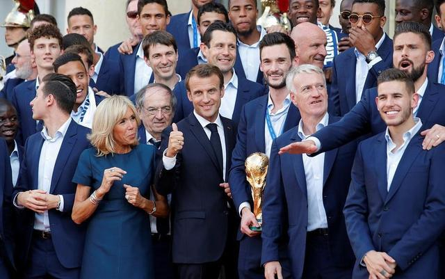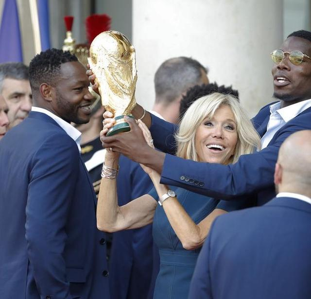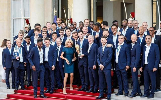凯旋了!通过凯旋门,直通爱丽舍宫!迎接世界杯新科冠军的,是一条长长的红地毯,走在最前面的,是法国队主教练德尚,以及手拿金杯的队长洛里。随后,队员们依次来到爱丽舍宫广场前,和法国总统合影。博格巴比较调皮,和总统夫人一起高举金杯!